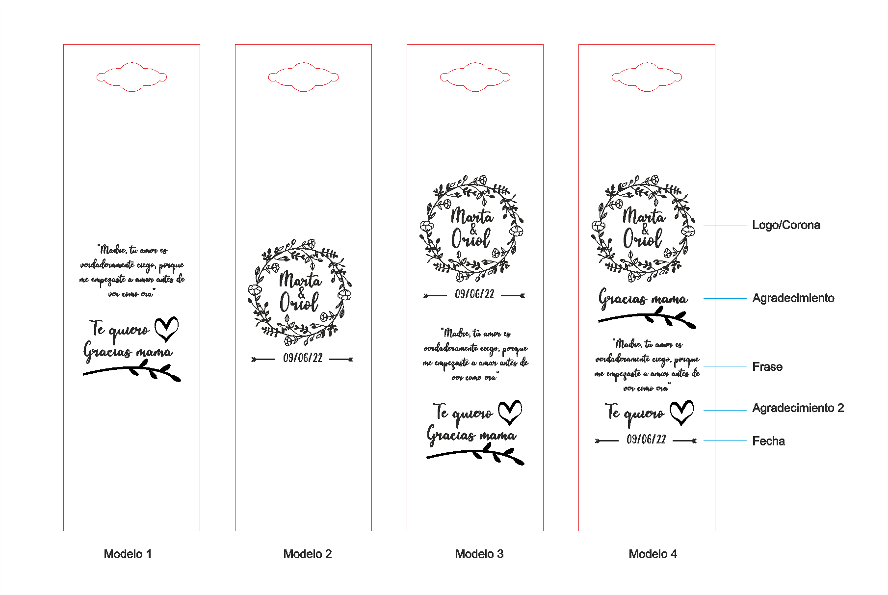 Puedes escoger el Diseño que más encaje con tu idea y cambiaremos los nombres, frases y logos para personalizar la caja de vino a tu gusto.