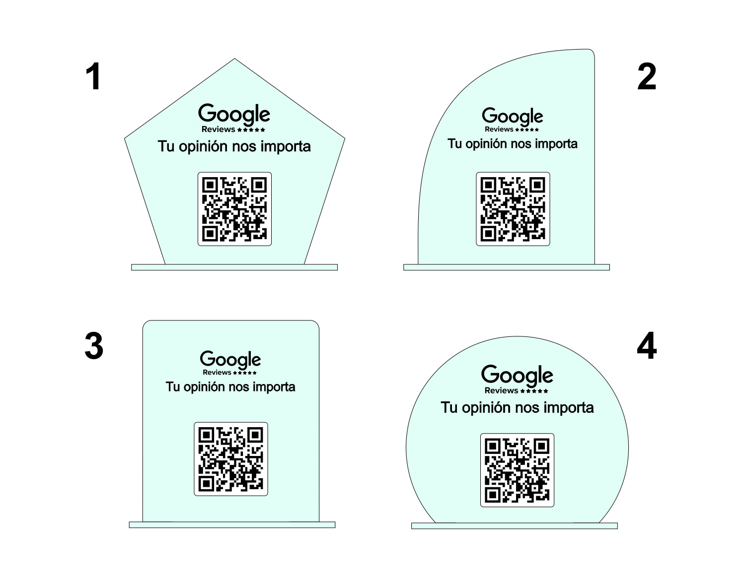 Disponemos del modelo de cartel con código qr para reseñas google en acrílico en varios acabados para el letrero para conseguir reseñas de Google personalizado, tanto simple en acrílico transparente como opciones con fondo de color acorde a tu marca.