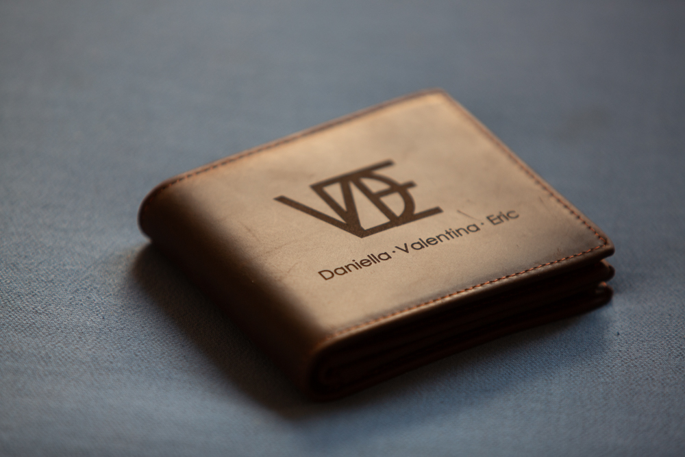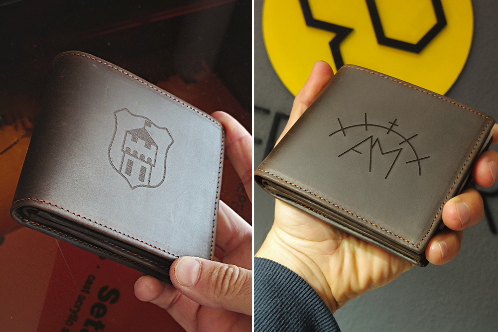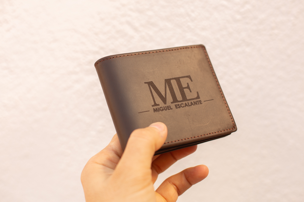 Cartera de cuero original de alta calidad para hombre personalizable con grabado de nombres, frases, logos, dibujos, diseños a medida mediante grabado láser de alta definición.