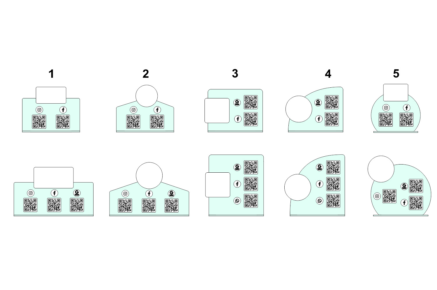 Las dimensiones de nuestros letreros QR están pensadas para ser visibles y funcionales en mostradores, áreas de pago o escritorios. Ofrecemos diferentes formas y tamaños según si el letrero es con 2 o 3 QR para las redes o enlaces que quieras conectar.