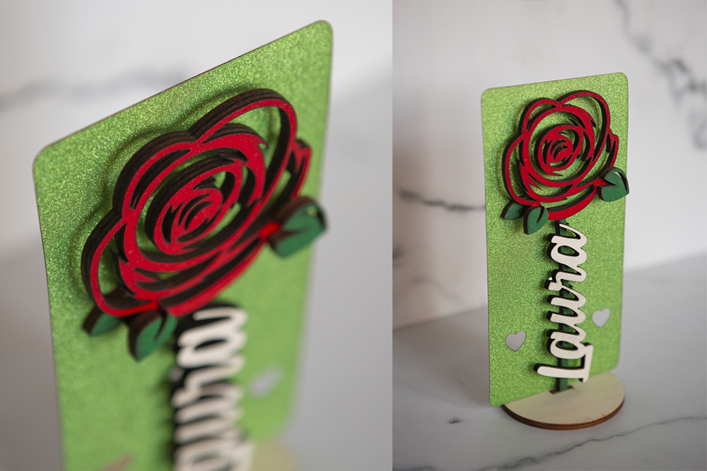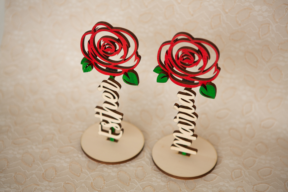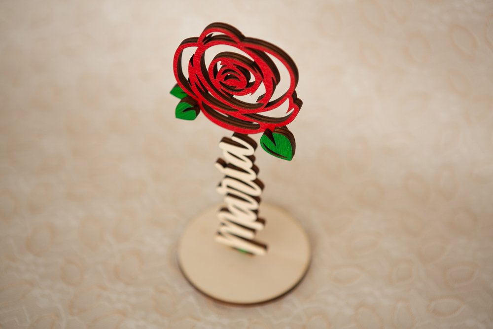 Rosa eterna artesanal hecha en madera y pintada a mano con nombre personalizado en letra elegante. INCLUYE: Rosa de 20cm de altura con base y 1 nombre.
